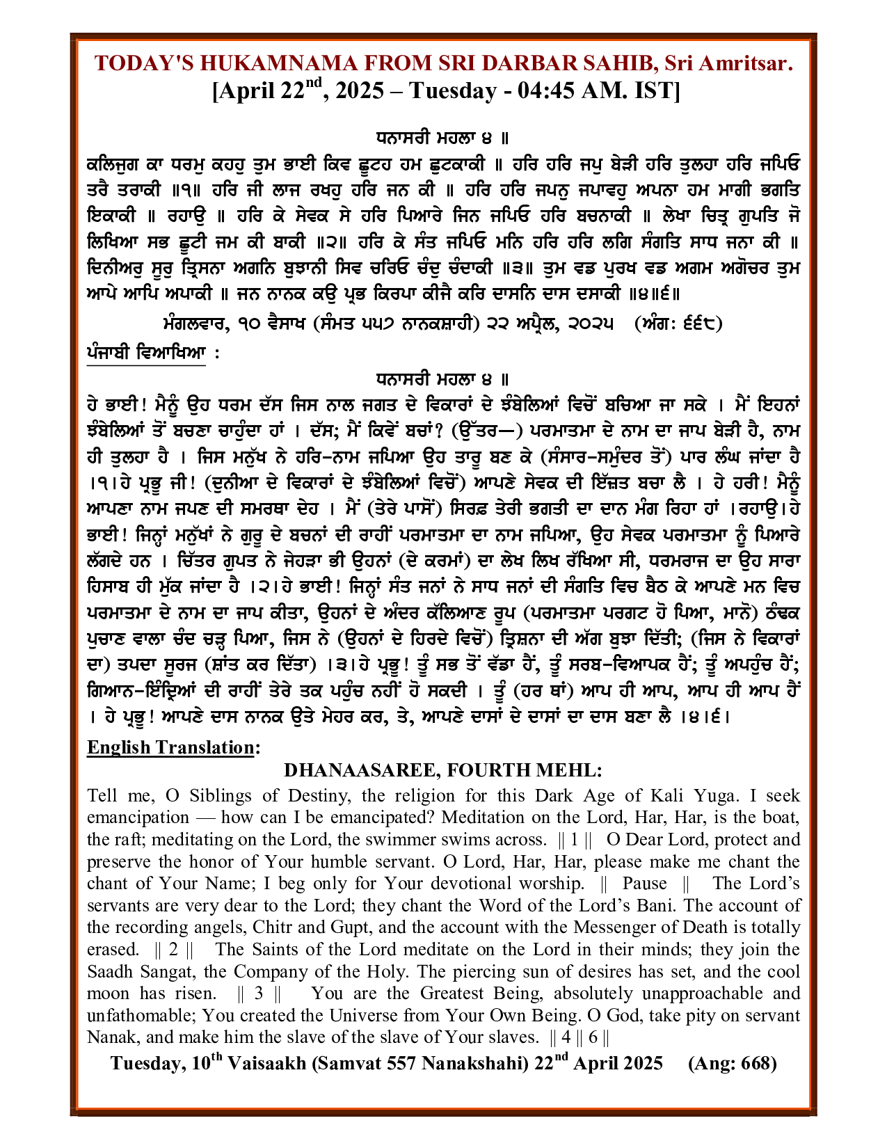 Source : SGPC Post navigation Today’s Daily Mukhwak Sri Darbar Saheb – April 21st, 2025 Today’s Daily Mukhwak Sri Darbar Saheb – April 23rd, 2025