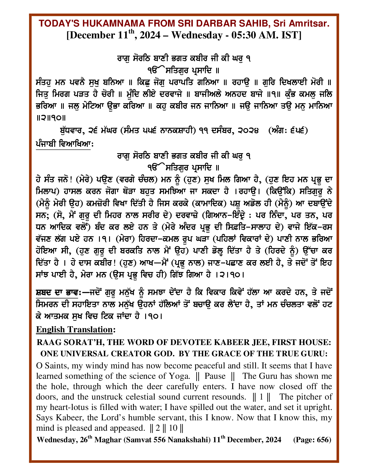 Source : SGPC Post navigation Today’s Daily Mukhwak Sri Darbar Saheb – December 10th, 2024 Today’s Daily Mukhwak Sri Darbar Saheb – December 12th, 2024