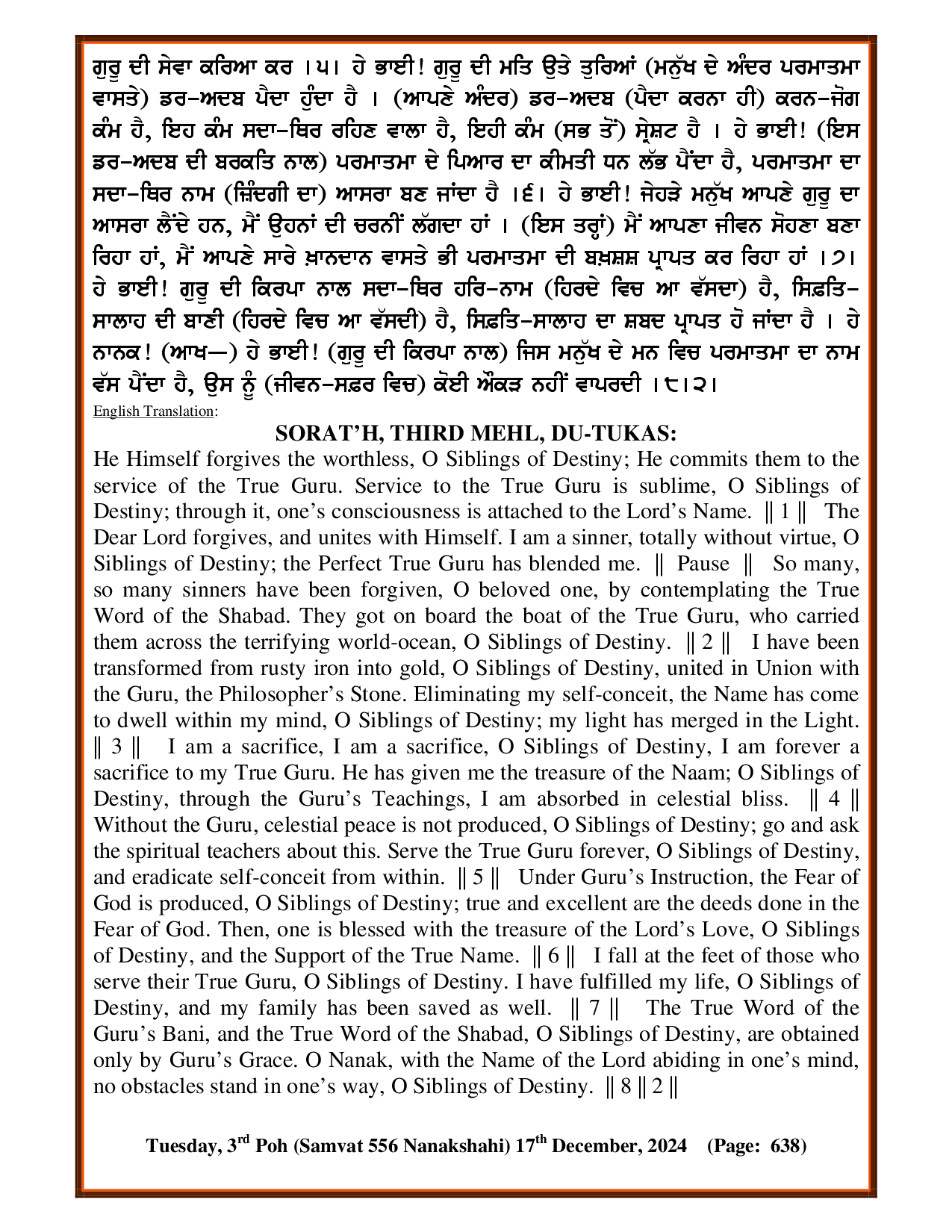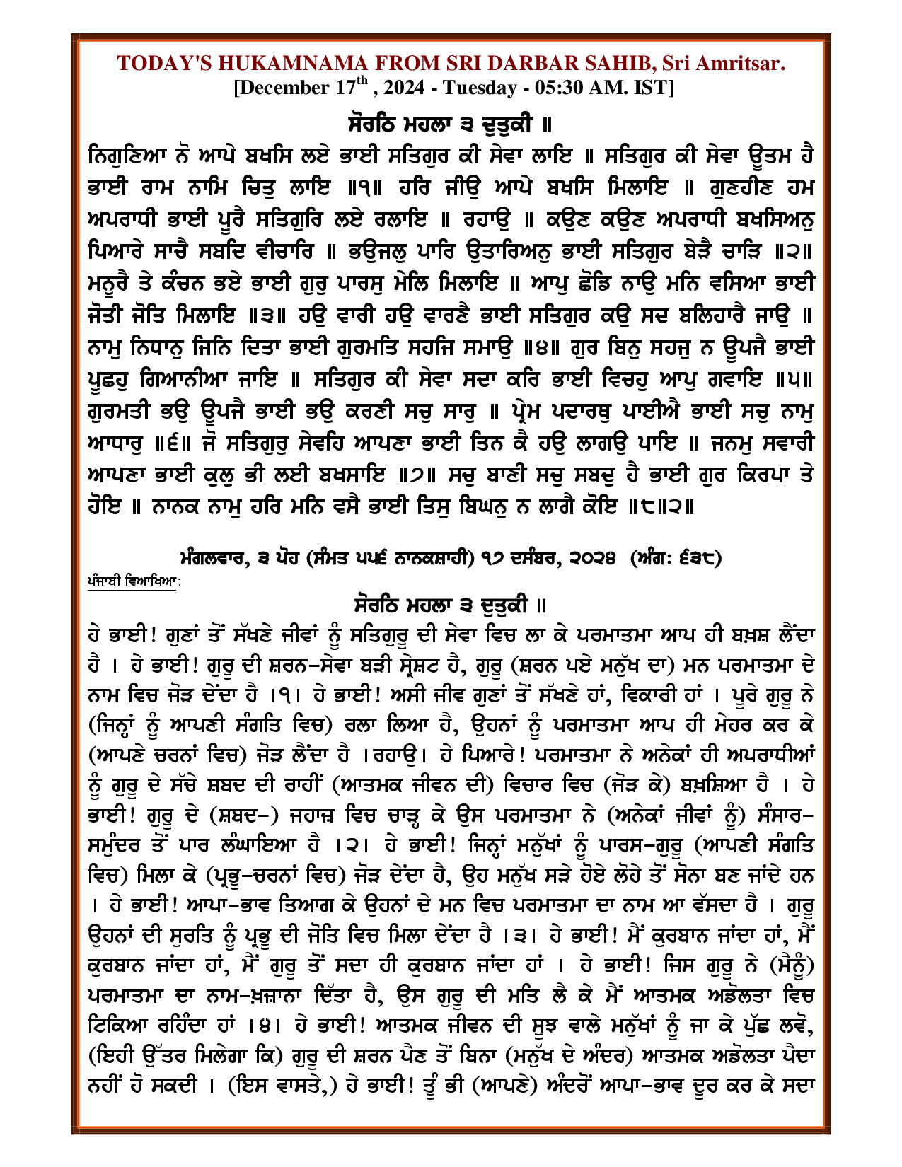 Source : SGPC Post navigation Today’s Daily Mukhwak Sri Darbar Saheb – December 16th, 2024 Today’s Daily Mukhwak Sri Darbar Saheb – December 18th, 2024