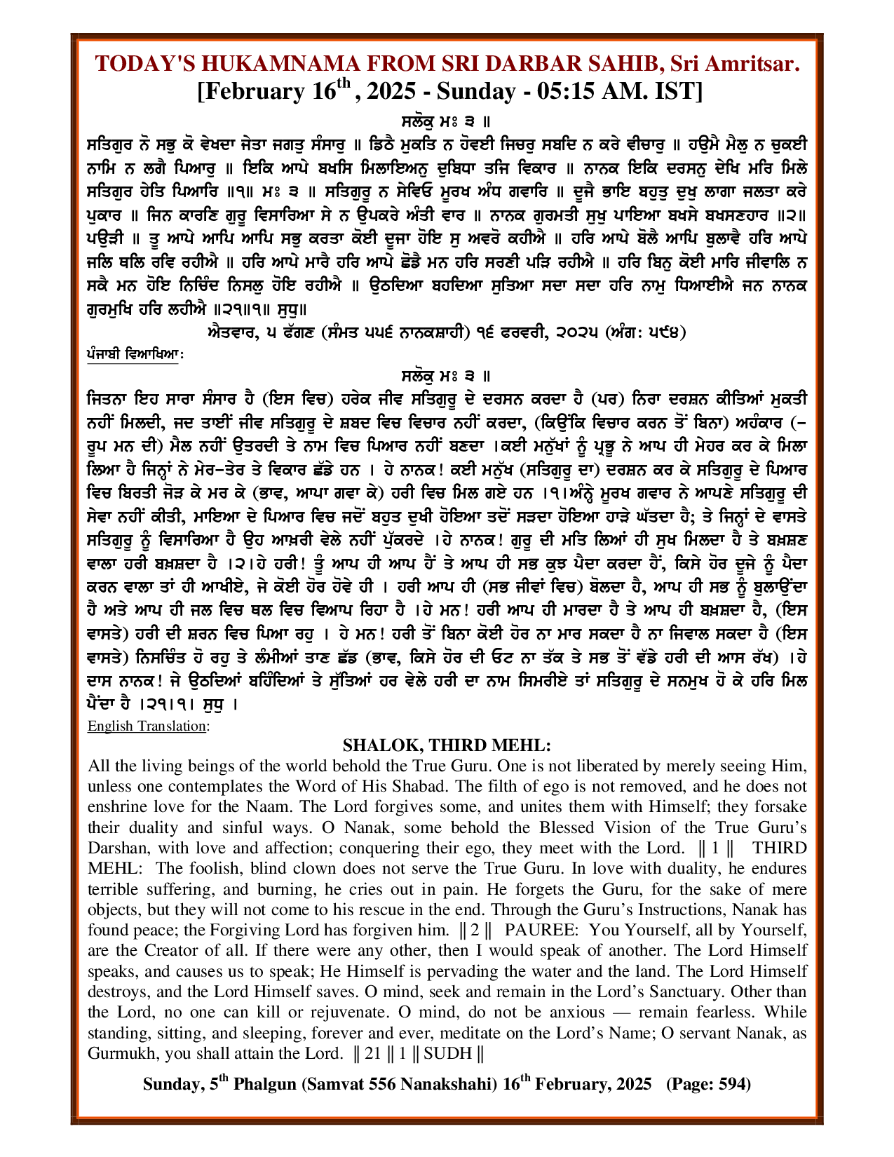Source : SGPC Post navigation Today’s Daily Mukhwak Sri Darbar Saheb – February 15th, 2025 Today’s Daily Mukhwak Sri Darbar Saheb – February 17th, 2025