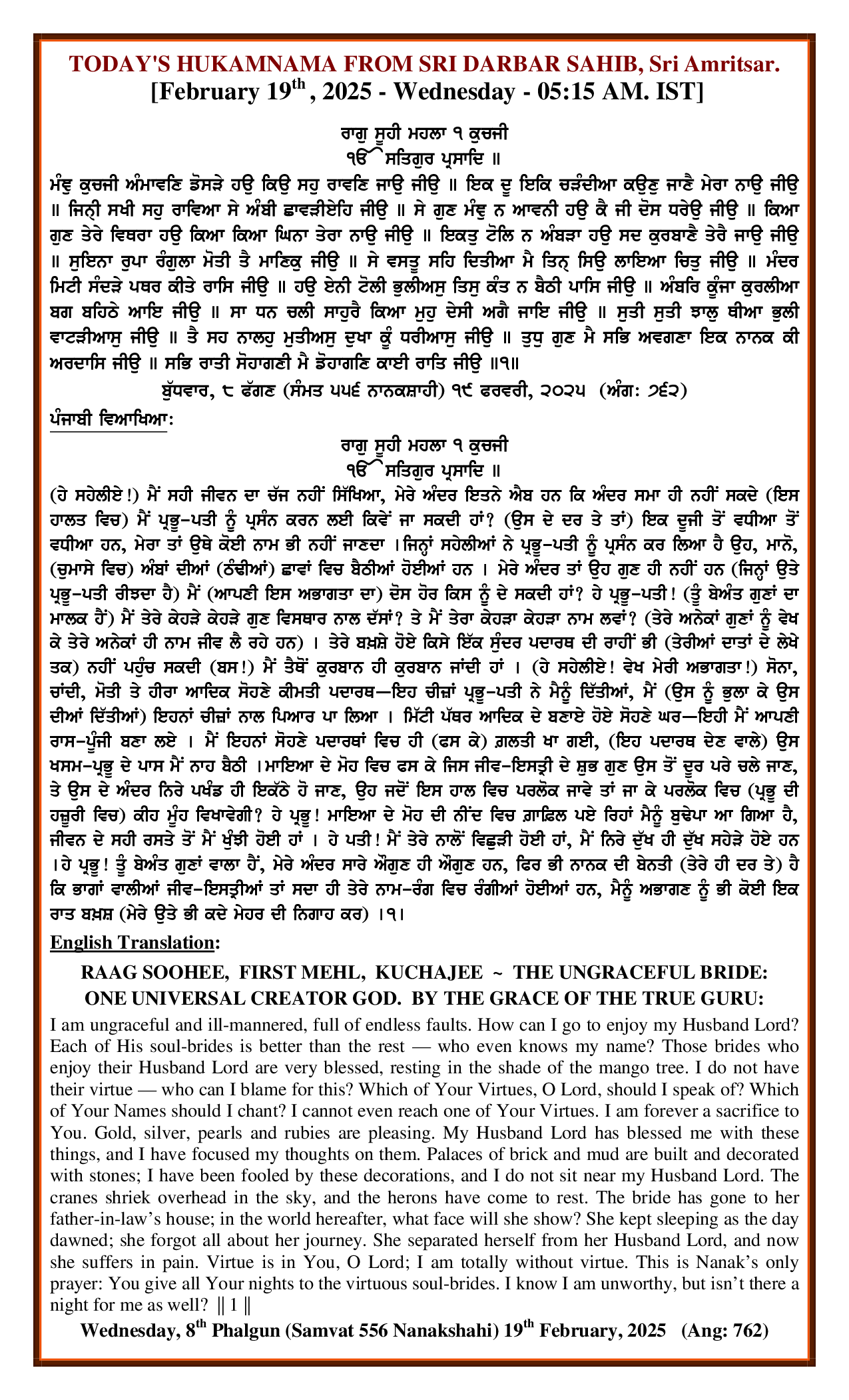 Source : SGPC Post navigation Today’s Daily Mukhwak Sri Darbar Saheb – February 18th, 2025 Today’s Daily Mukhwak Sri Darbar Saheb – February 20th, 2025