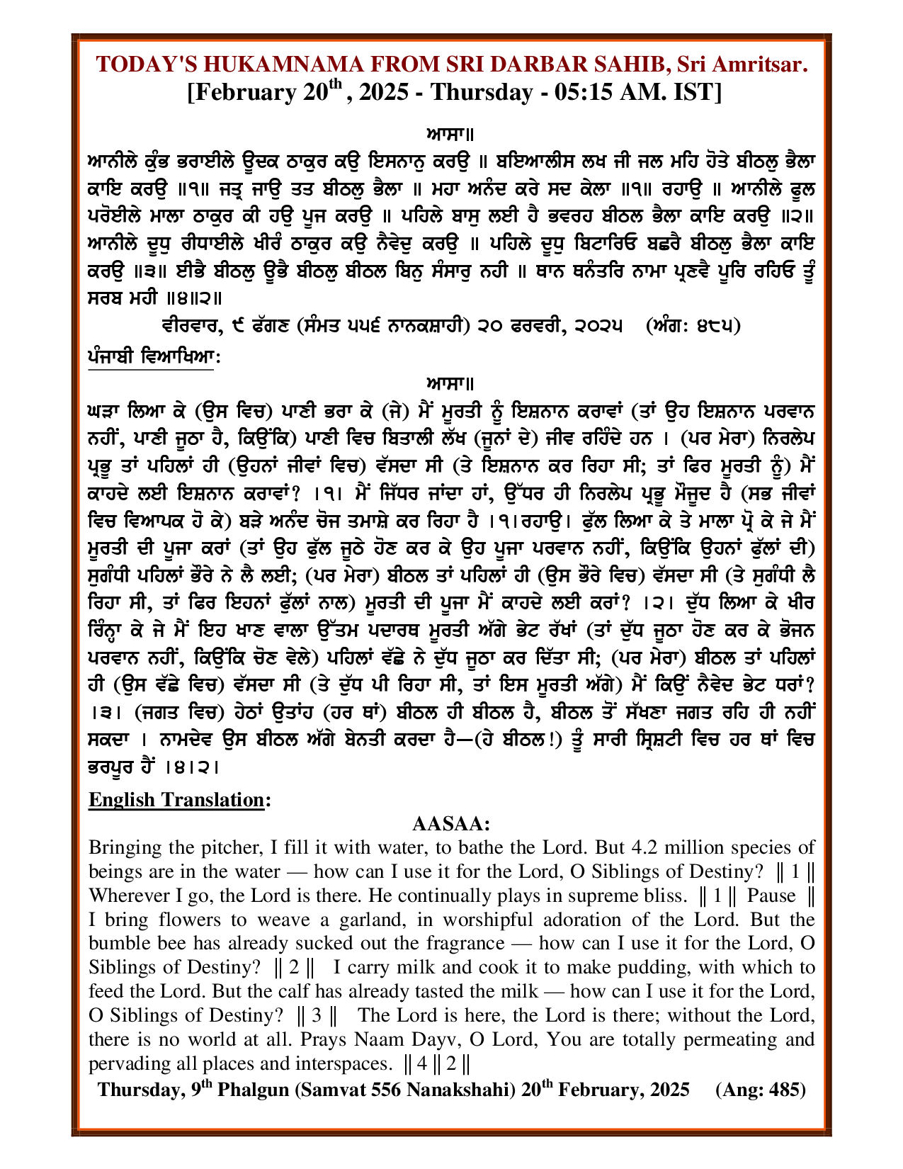 Source : SGPC Post navigation Today’s Daily Mukhwak Sri Darbar Saheb – February 19th, 2025 Today’s Daily Mukhwak Sri Darbar Saheb – February 21st, 2025