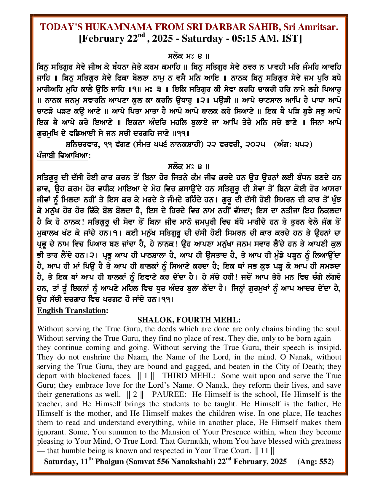 Source : SGPC Post navigation Today’s Daily Mukhwak Sri Darbar Saheb – February 21st, 2025 Today’s Daily Mukhwak Sri Darbar Saheb – February 23rd, 2025