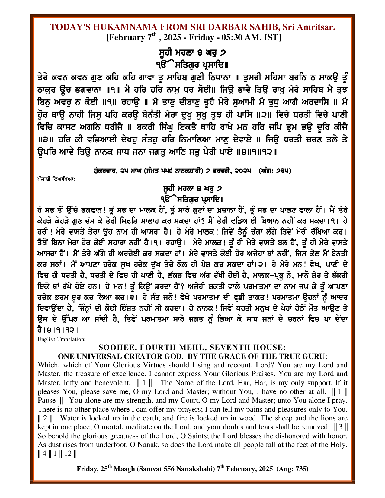 Source : SGPC Post navigation Today’s Daily Mukhwak Sri Darbar Saheb – February 6th, 2025 Today’s Daily Mukhwak Sri Darbar Saheb – February 8th, 2025