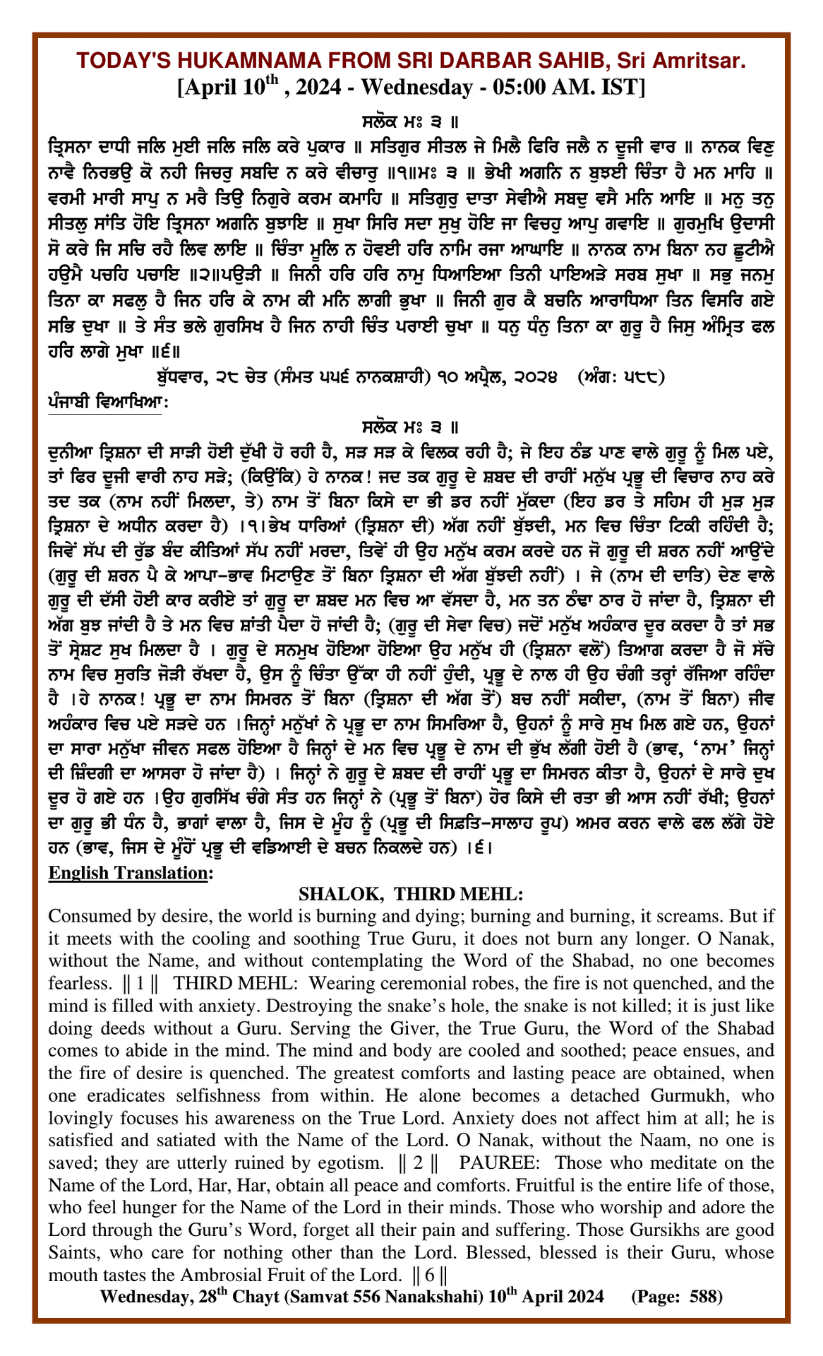 Source : SGPC Post navigation Today’s MUKHWAK Sri Darbar Saheb Amritsar – April 9th, 2024 Today’s MUKHWAK Sri Darbar Saheb Amritsar – April 11th, 2024