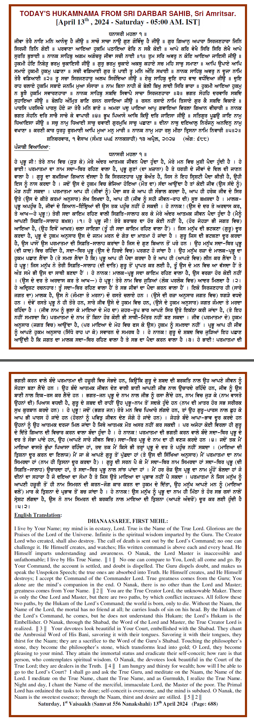 Source : SGPC Post navigation Today’s MUKHWAK Sri Darbar Saheb Amritsar – April 12th, 2024 Today’s MUKHWAK Sri Darbar Saheb Amritsar – April 14th, 2024