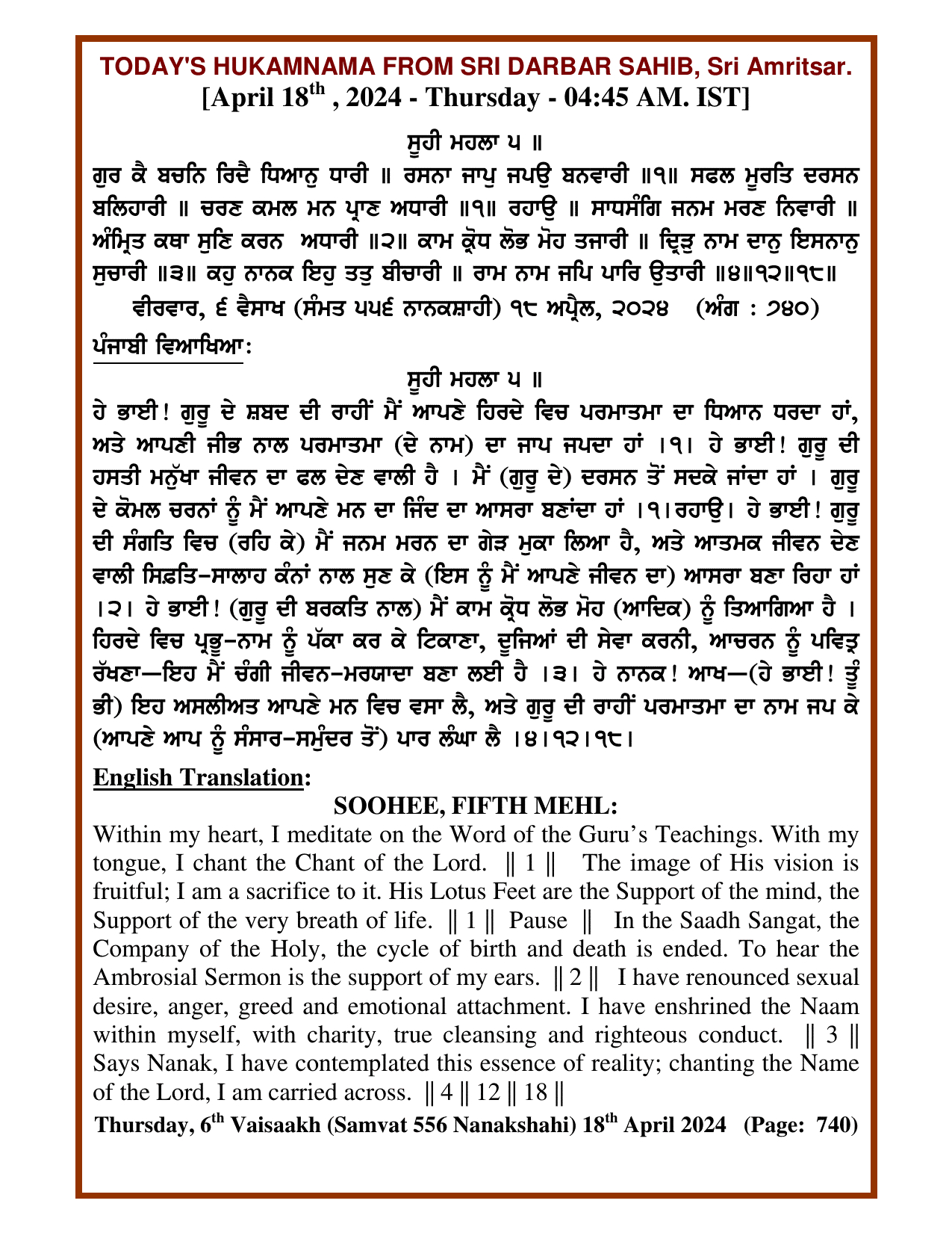 Source : SGPC Post navigation Today’s MUKHWAK Sri Darbar Saheb Amritsar – April 17th, 2024 Today’s MUKHWAK Sri Darbar Saheb Amritsar – April 19th, 2024