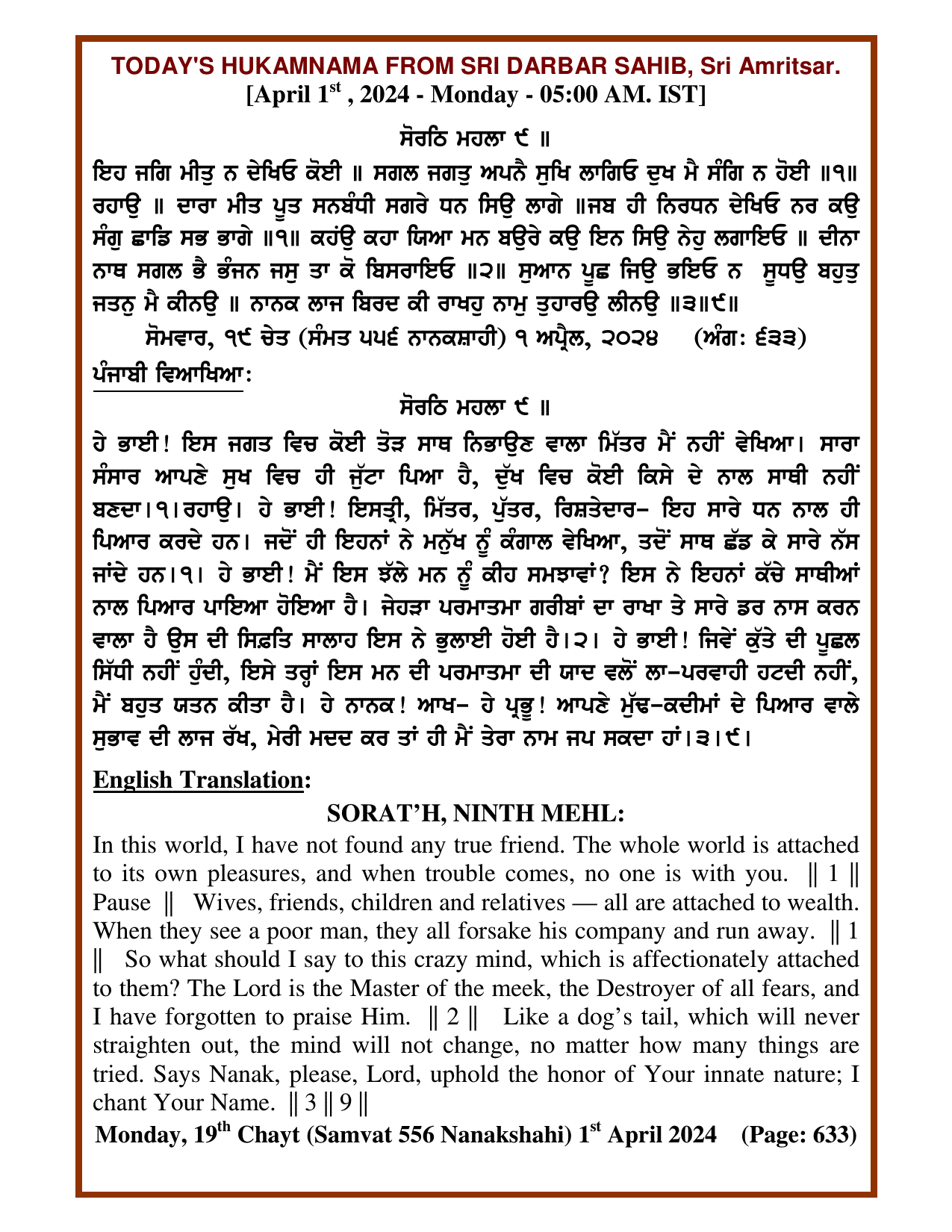 Source : SGPC Post navigation Today’s MUKHWAK Sri Darbar Saheb Amritsar – March 31st, 2024 Today’s MUKHWAK Sri Darbar Saheb Amritsar – April 2nd, 2024
