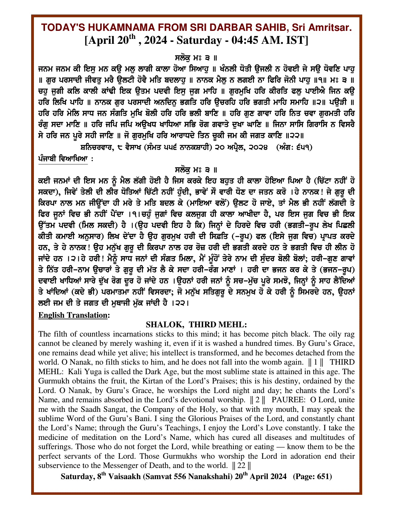 Source : SGPC Post navigation Today’s MUKHWAK Sri Darbar Saheb Amritsar – April 19th, 2024 Today’s MUKHWAK Sri Darbar Saheb Amritsar – April 21st, 2024