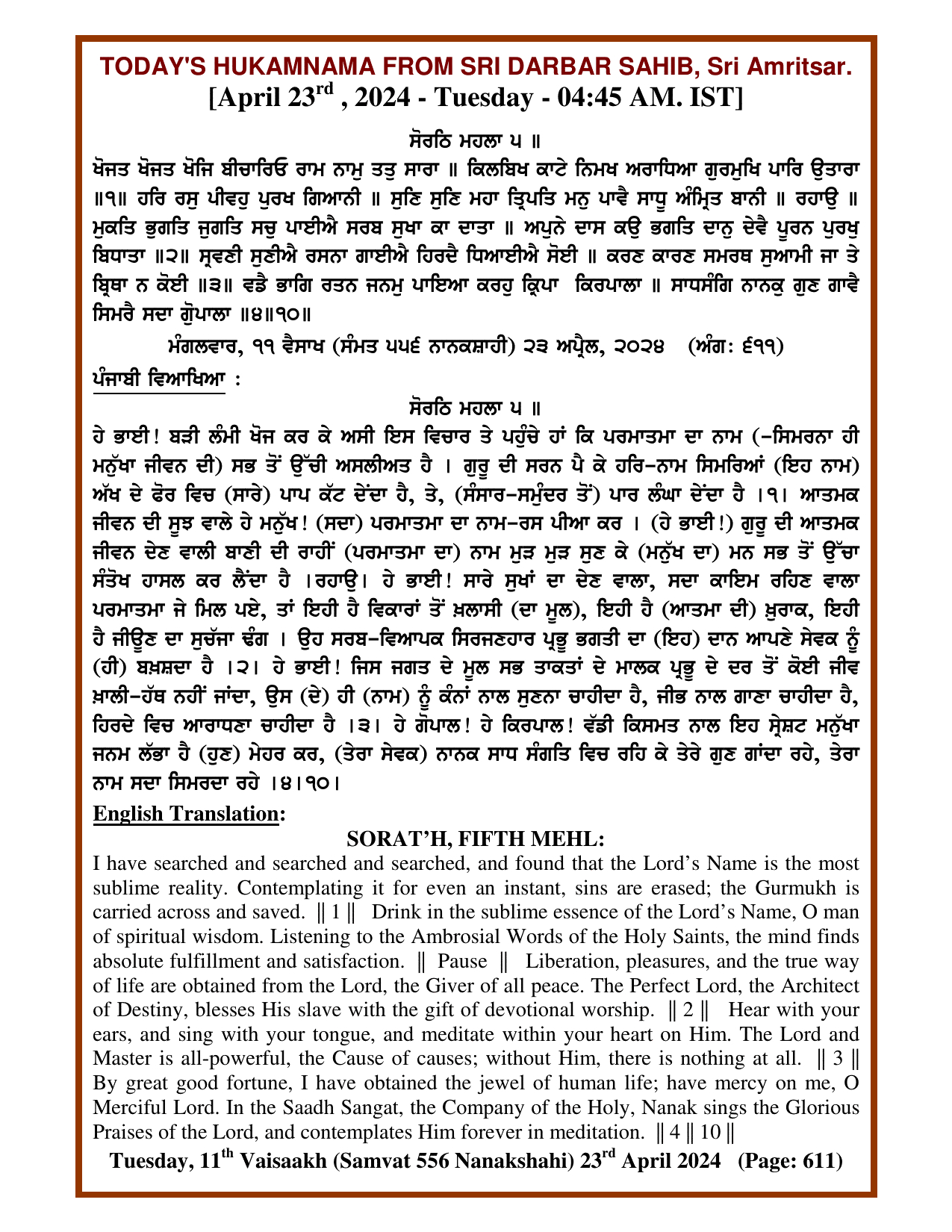 Source : SGPC Post navigation Today’s MUKHWAK Sri Darbar Saheb Amritsar – April 22nd, 2024 Today’s MUKHWAK Sri Darbar Saheb Amritsar – April 24th, 2024
