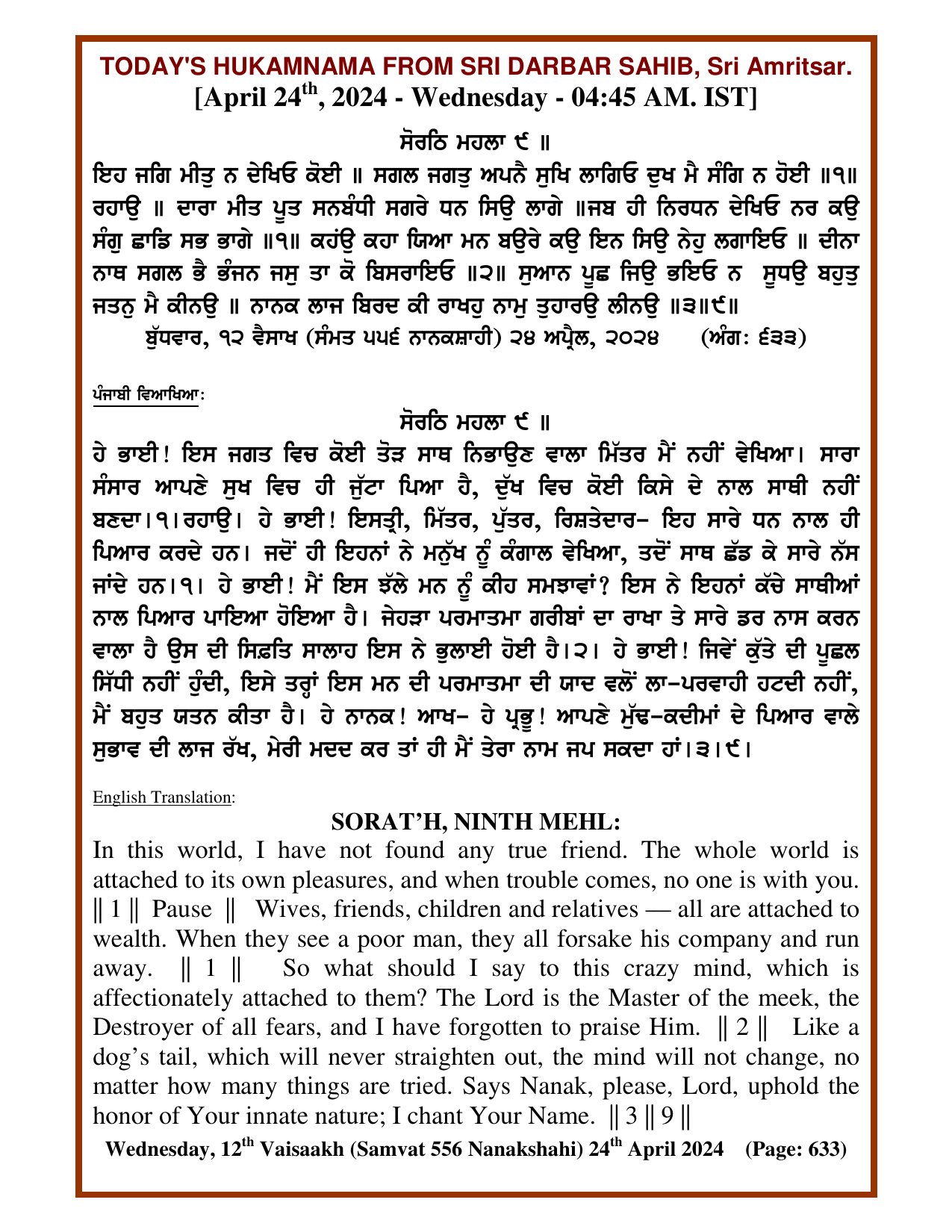 Source : SGPC Post navigation Today’s MUKHWAK Sri Darbar Saheb Amritsar – April 23rd, 2024 Today’s MUKHWAK Sri Darbar Saheb Amritsar – April 25th, 2024
