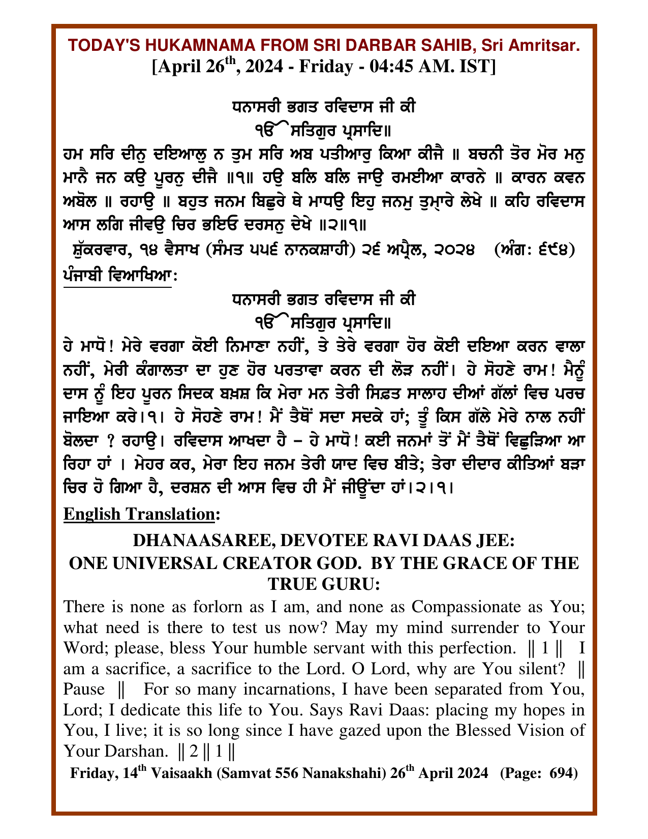Source : SGPC Post navigation Today’s MUKHWAK Sri Darbar Saheb Amritsar – April 25th, 2024 Today’s MUKHWAK Sri Darbar Saheb Amritsar – April 27th, 2024