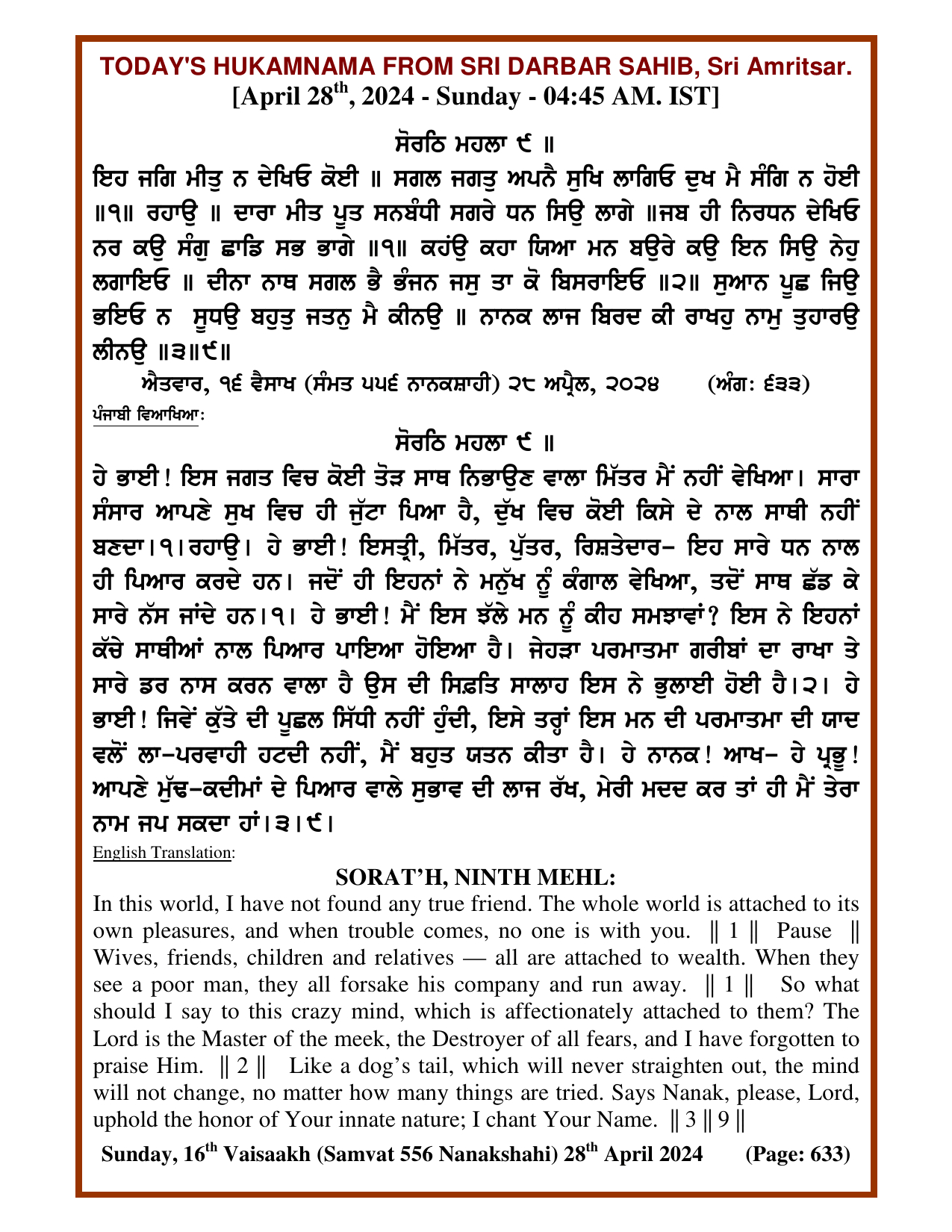 Source : SGPC Post navigation Today’s MUKHWAK Sri Darbar Saheb Amritsar – April 27th, 2024 Today’s MUKHWAK Sri Darbar Saheb Amritsar – April 29th, 2024