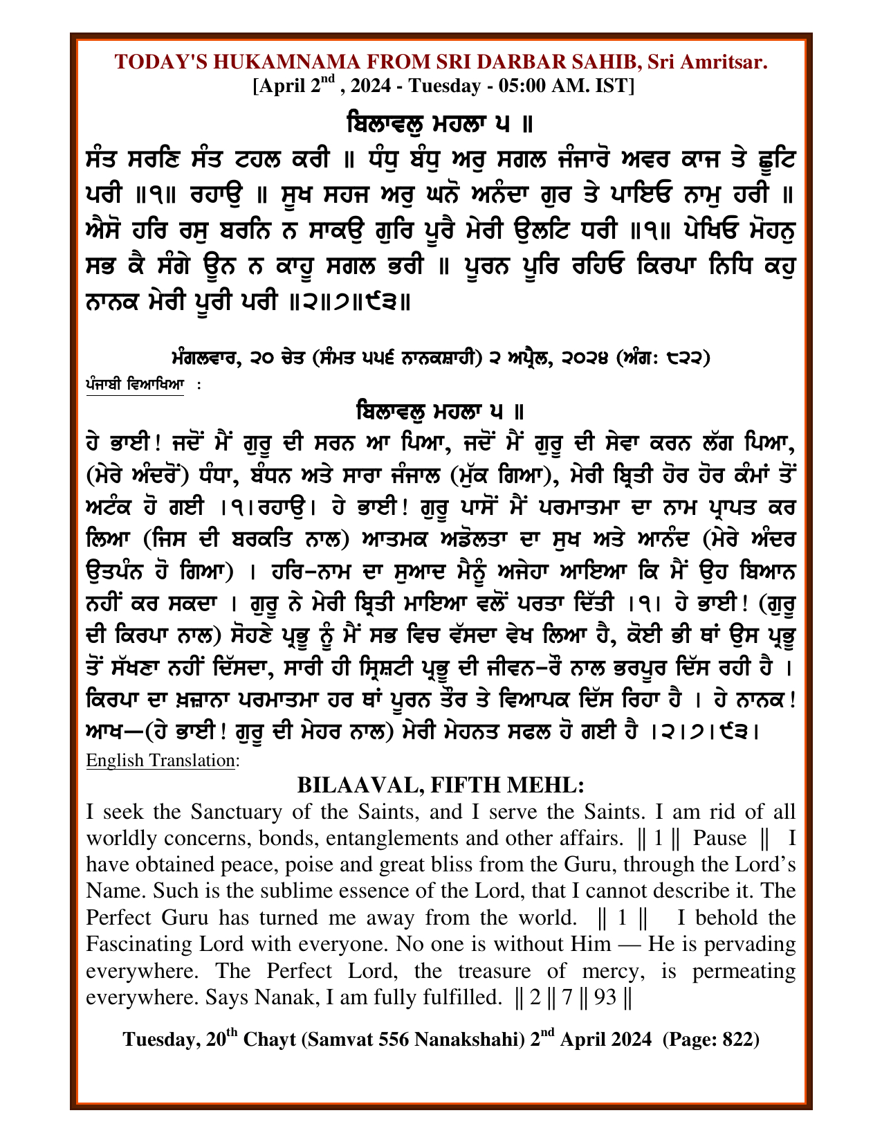 Source : SGPC Post navigation Today’s MUKHWAK Sri Darbar Saheb Amritsar – April 1st, 2024 Today’s MUKHWAK Sri Darbar Saheb Amritsar – April 3rd, 2024