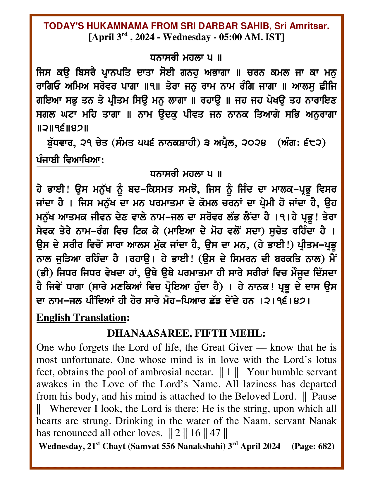 Source : SGPC Post navigation Today’s MUKHWAK Sri Darbar Saheb Amritsar – April 2nd, 2024 Today’s MUKHWAK Sri Darbar Saheb Amritsar – April 4th, 2024