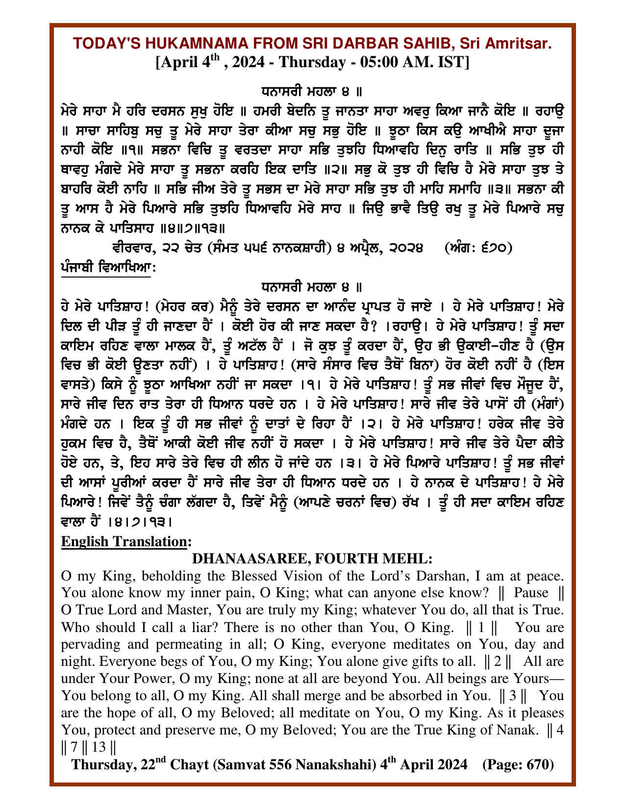 Source : SGPC Post navigation Today’s MUKHWAK Sri Darbar Saheb Amritsar – April 3rd, 2024 Today’s MUKHWAK Sri Darbar Saheb Amritsar – April 5th, 2024