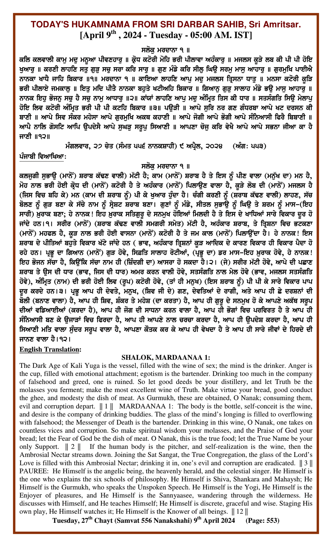 Source : SGPC Post navigation Today’s MUKHWAK Sri Darbar Saheb Amritsar – April 8th, 2024 Today’s MUKHWAK Sri Darbar Saheb Amritsar – April 10th, 2024