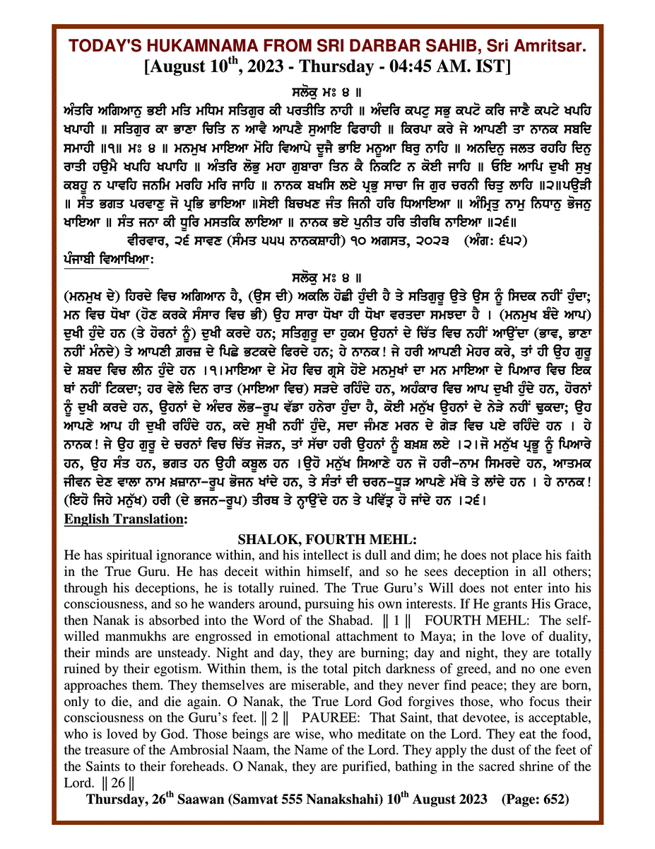 Source : SGPC Post navigation Today’s MUKHWAK Sri Darbar Saheb Amritsar – August 9th, 2023 Today’s MUKHWAK Sri Darbar Saheb Amritsar – August 11th, 2023