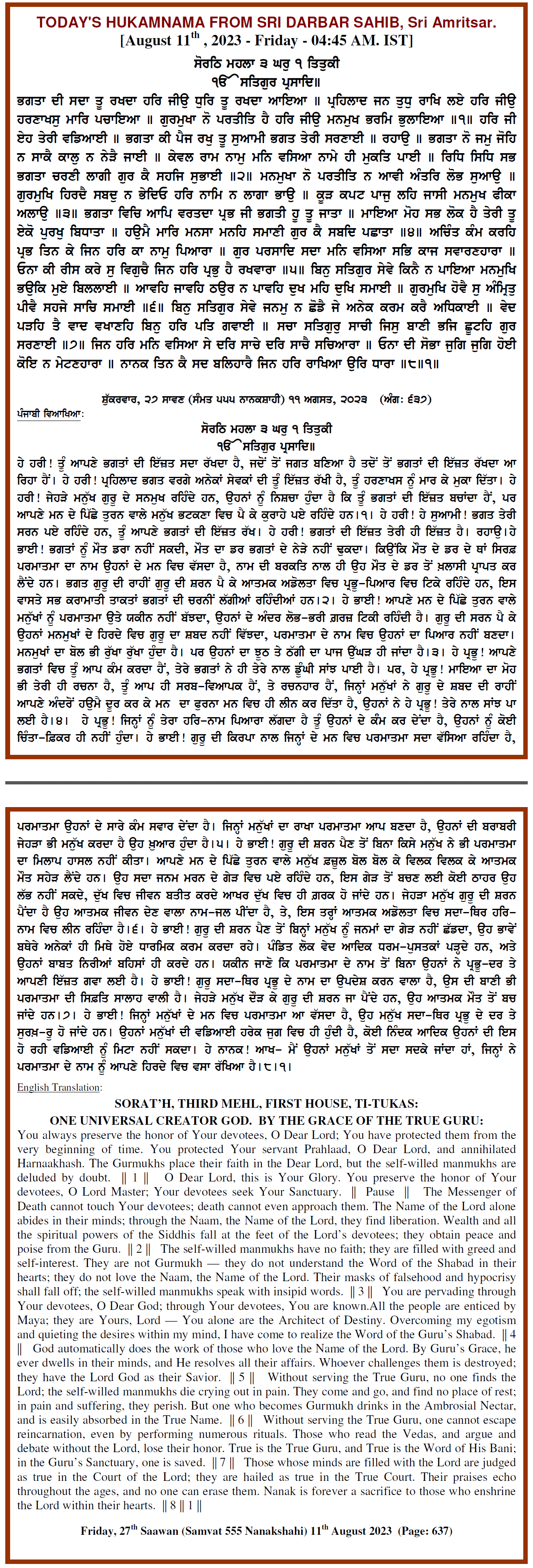 Source : SGPC Post navigation Today’s MUKHWAK Sri Darbar Saheb Amritsar – August 10th, 2023 Today’s MUKHWAK Sri Darbar Saheb Amritsar – August 12th, 2023