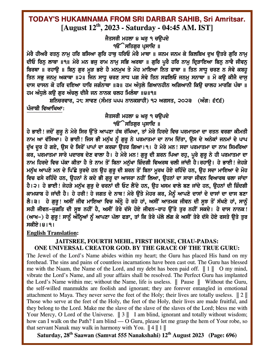 Source : SGPC Post navigation Today’s MUKHWAK Sri Darbar Saheb Amritsar – August 11th, 2023 Today’s MUKHWAK Sri Darbar Saheb Amritsar – August 13th, 2023