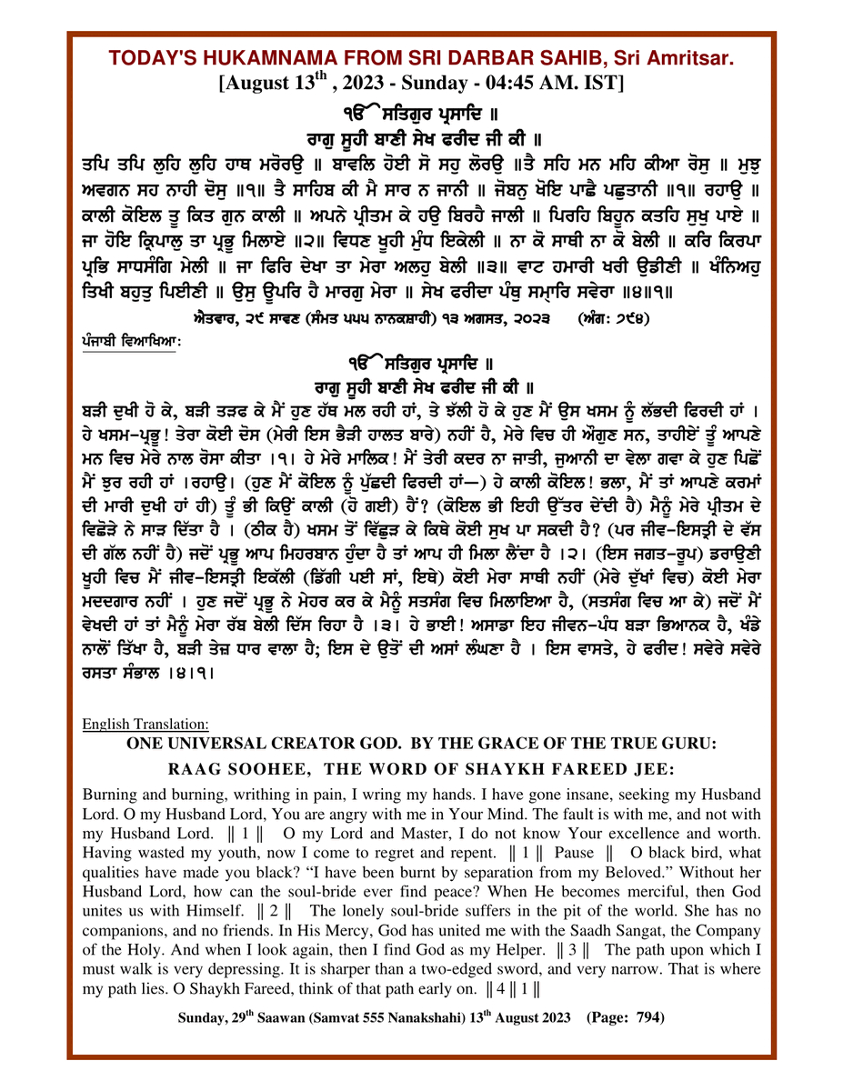 Source : SGPC Post navigation Today’s MUKHWAK Sri Darbar Saheb Amritsar – August 12th, 2023 Today’s MUKHWAK Sri Darbar Saheb Amritsar – August 14th, 2023