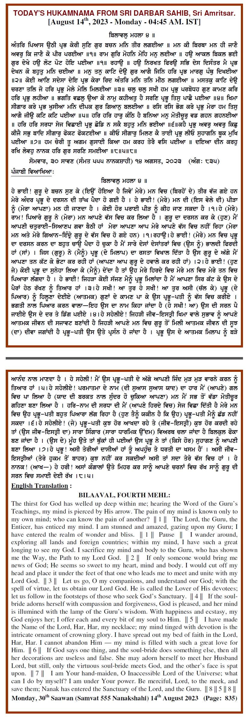Source : SGPC Post navigation Today’s MUKHWAK Sri Darbar Saheb Amritsar – August 13th, 2023 Today’s MUKHWAK Sri Darbar Saheb Amritsar – August 15th, 2023