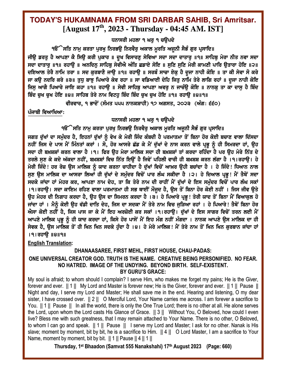 Source : SGPC Post navigation Today’s MUKHWAK Sri Darbar Saheb Amritsar – August 16th, 2023 Today’s MUKHWAK Sri Darbar Saheb Amritsar – August 18th, 2023