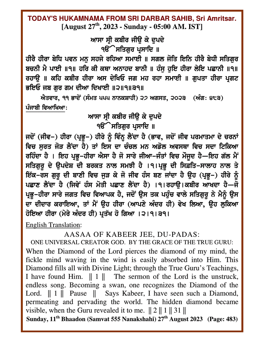 Source : SGPC Post navigation Today’s MUKHWAK Sri Darbar Saheb Amritsar – August 26th, 2023 Today’s MUKHWAK Sri Darbar Saheb Amritsar – August 28th, 2023