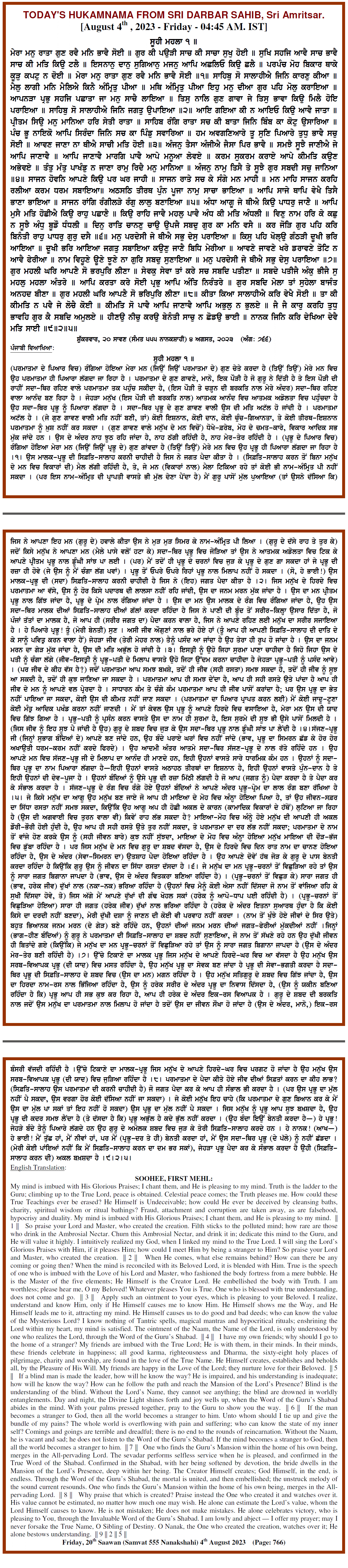 Source : SGPC Post navigation Today’s MUKHWAK Sri Darbar Saheb Amritsar – August 3rd, 2023 Today’s MUKHWAK Sri Darbar Saheb Amritsar – August 5th, 2023