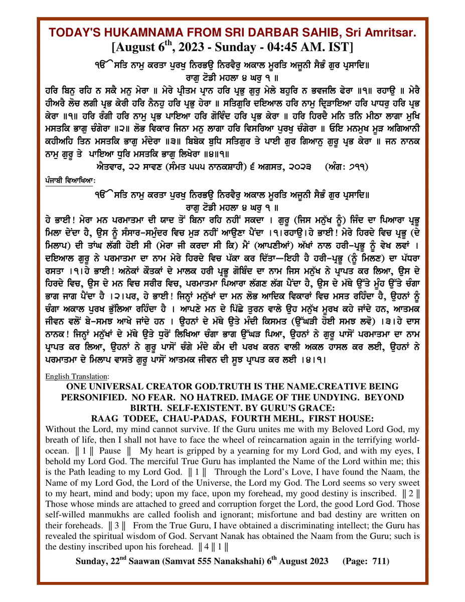 Source : SGPC Post navigation Today’s MUKHWAK Sri Darbar Saheb Amritsar – August 5th, 2023 Today’s MUKHWAK Sri Darbar Saheb Amritsar – August 7th, 2023