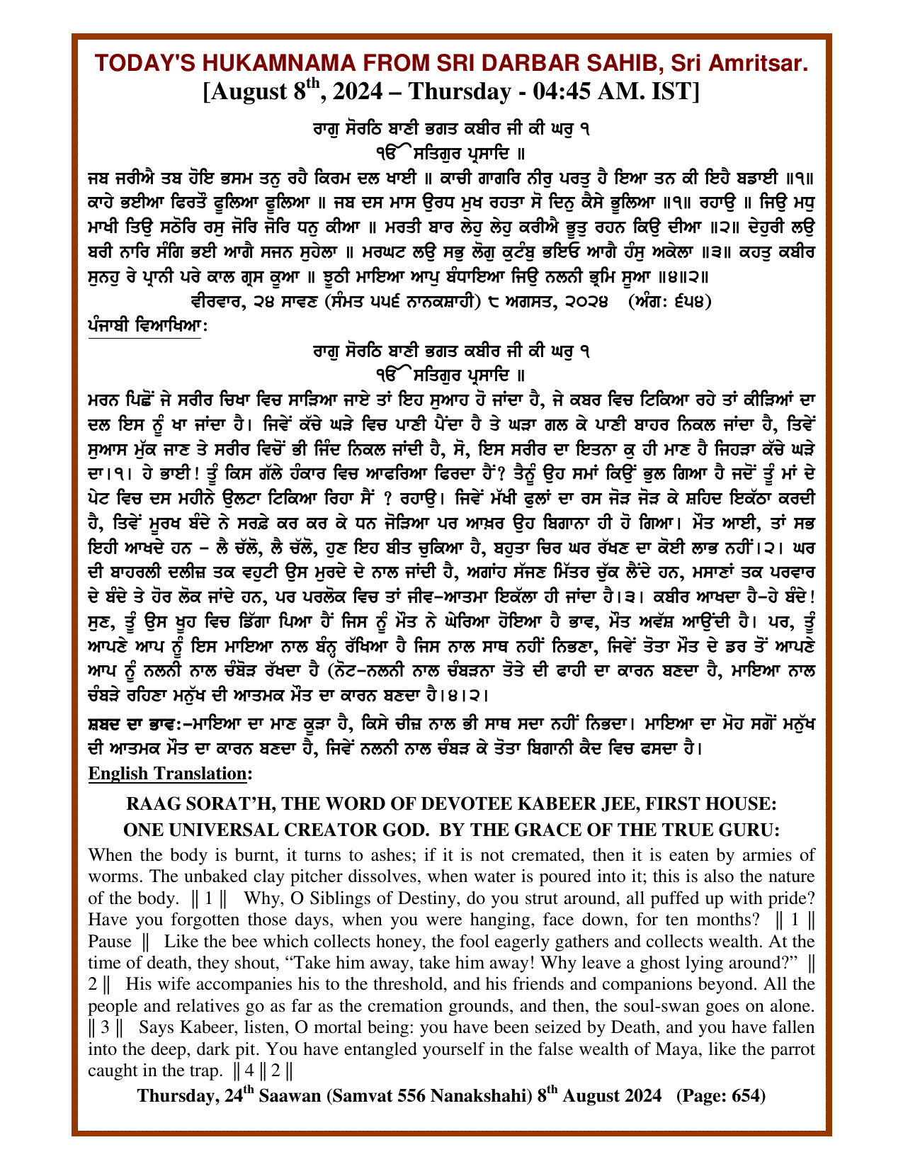 Source : SGPC Post navigation Today’s MUKHWAK Sri Darbar Saheb Amritsar – August 7th, 2024 Today’s MUKHWAK Sri Darbar Saheb Amritsar – August 9th, 2024