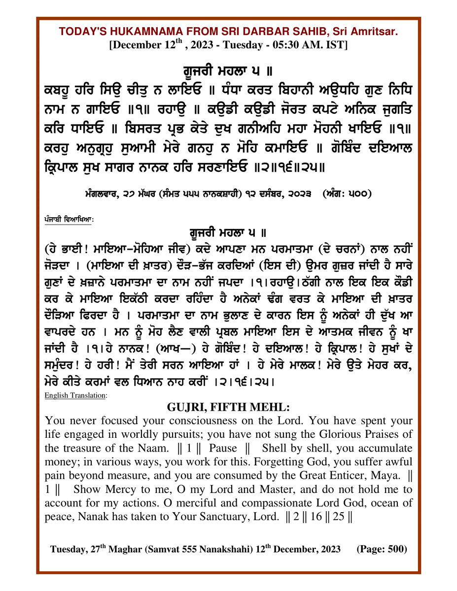 Source : SGPC Post navigation Today’s MUKHWAK Sri Darbar Saheb Amritsar – December 11th, 2023 Today’s MUKHWAK Sri Darbar Saheb Amritsar – December 13th, 2023