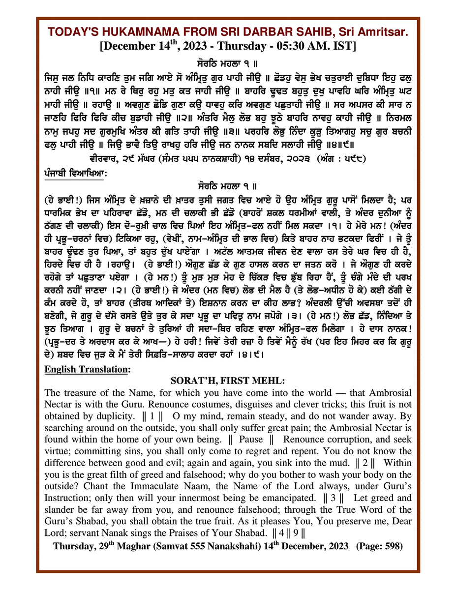 Source : SGPC Post navigation Today’s MUKHWAK Sri Darbar Saheb Amritsar – December 13th, 2023 Today’s MUKHWAK Sri Darbar Saheb Amritsar – December 15th, 2023