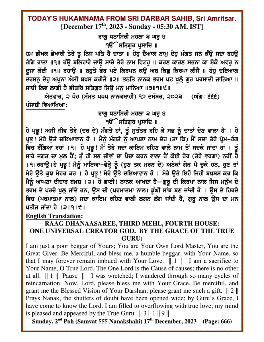 Source : SGPC Post navigation Today’s MUKHWAK Sri Darbar Saheb Amritsar – December 16th, 2023 Today’s MUKHWAK Sri Darbar Saheb Amritsar – December 18th, 2023