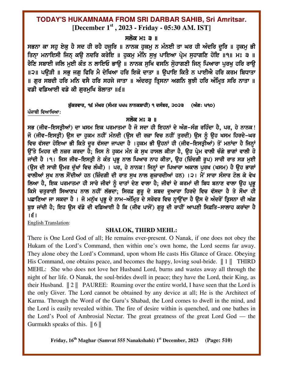 Source : SGPC Post navigation Today’s MUKHWAK Sri Darbar Saheb Amritsar – November 30th, 2023 Today’s MUKHWAK Sri Darbar Saheb Amritsar – December 2nd, 2023