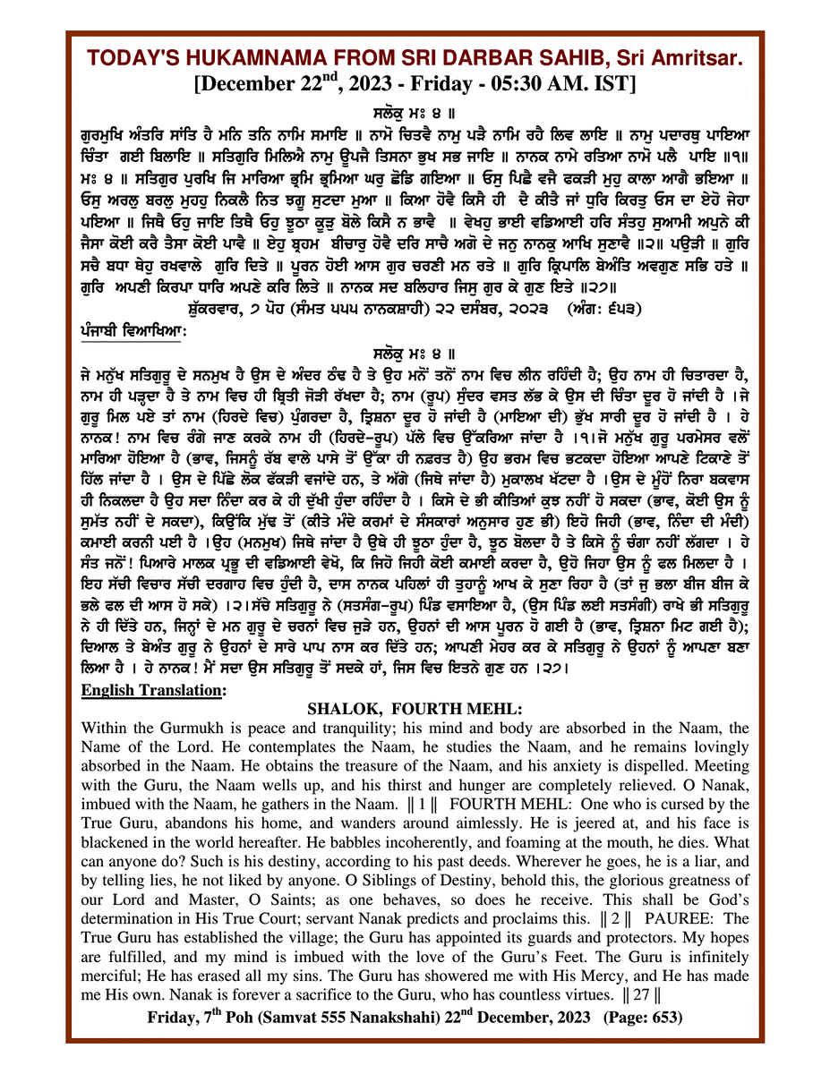 Source : SGPC Post navigation Today’s MUKHWAK Sri Darbar Saheb Amritsar – December 21st, 2023 Today’s MUKHWAK Sri Darbar Saheb Amritsar – December 23rd, 2023
