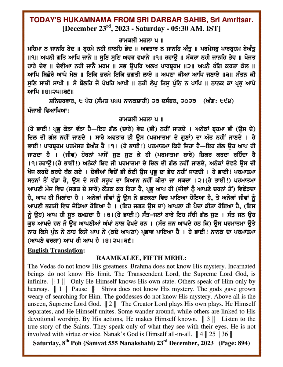 Source : SGPC Post navigation Today’s MUKHWAK Sri Darbar Saheb Amritsar – December 22nd, 2023 Today’s MUKHWAK Sri Darbar Saheb Amritsar – December 24th, 2023