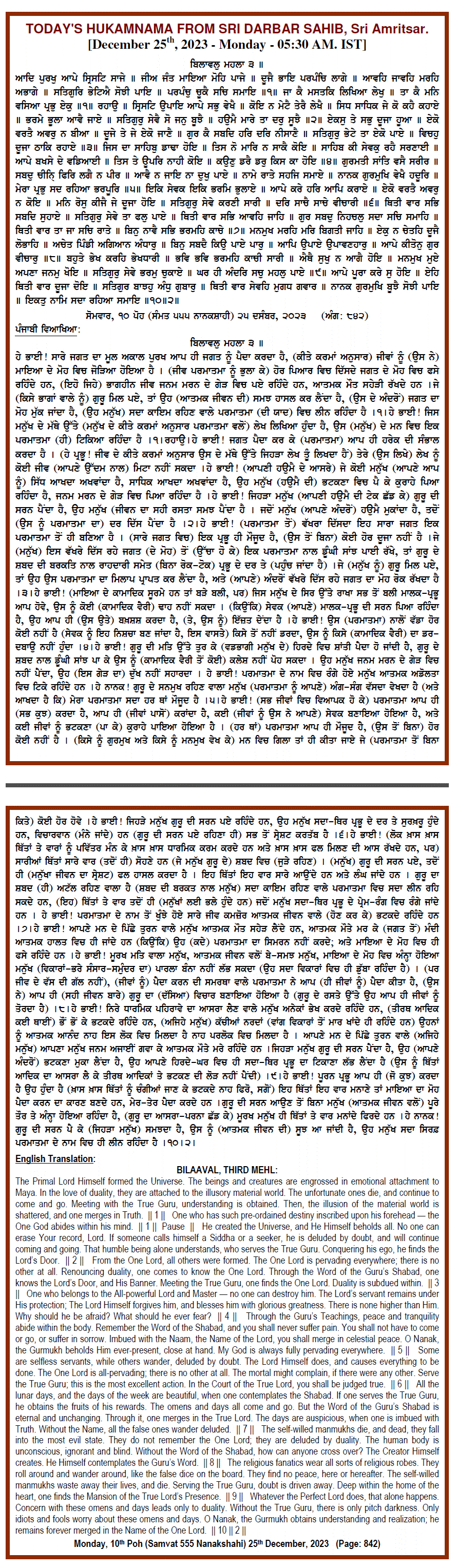 Source : SGPC Post navigation Today’s MUKHWAK Sri Darbar Saheb Amritsar – December 24th, 2023 Today’s MUKHWAK Sri Darbar Saheb Amritsar – December 26th, 2023