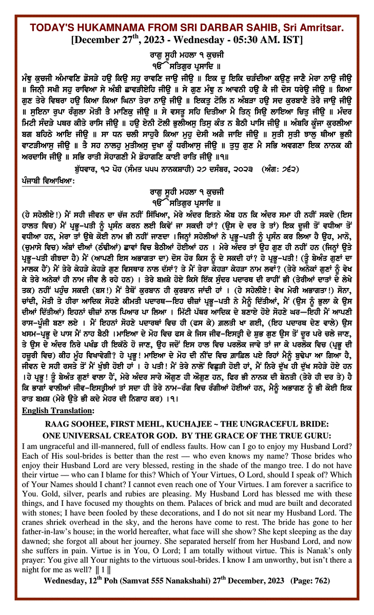 Source : SGPC Post navigation Today’s MUKHWAK Sri Darbar Saheb Amritsar – December 26th, 2023 Today’s MUKHWAK Sri Darbar Saheb Amritsar – December 28th, 2023