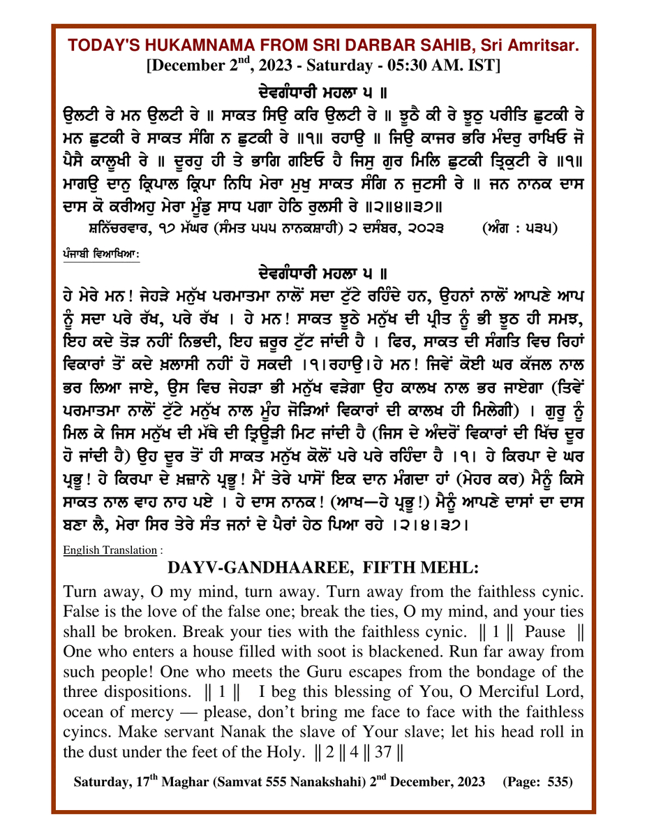 Source : SGPC Post navigation Today’s MUKHWAK Sri Darbar Saheb Amritsar – December 1st, 2023 Today’s MUKHWAK Sri Darbar Saheb Amritsar – December 3rd, 2023