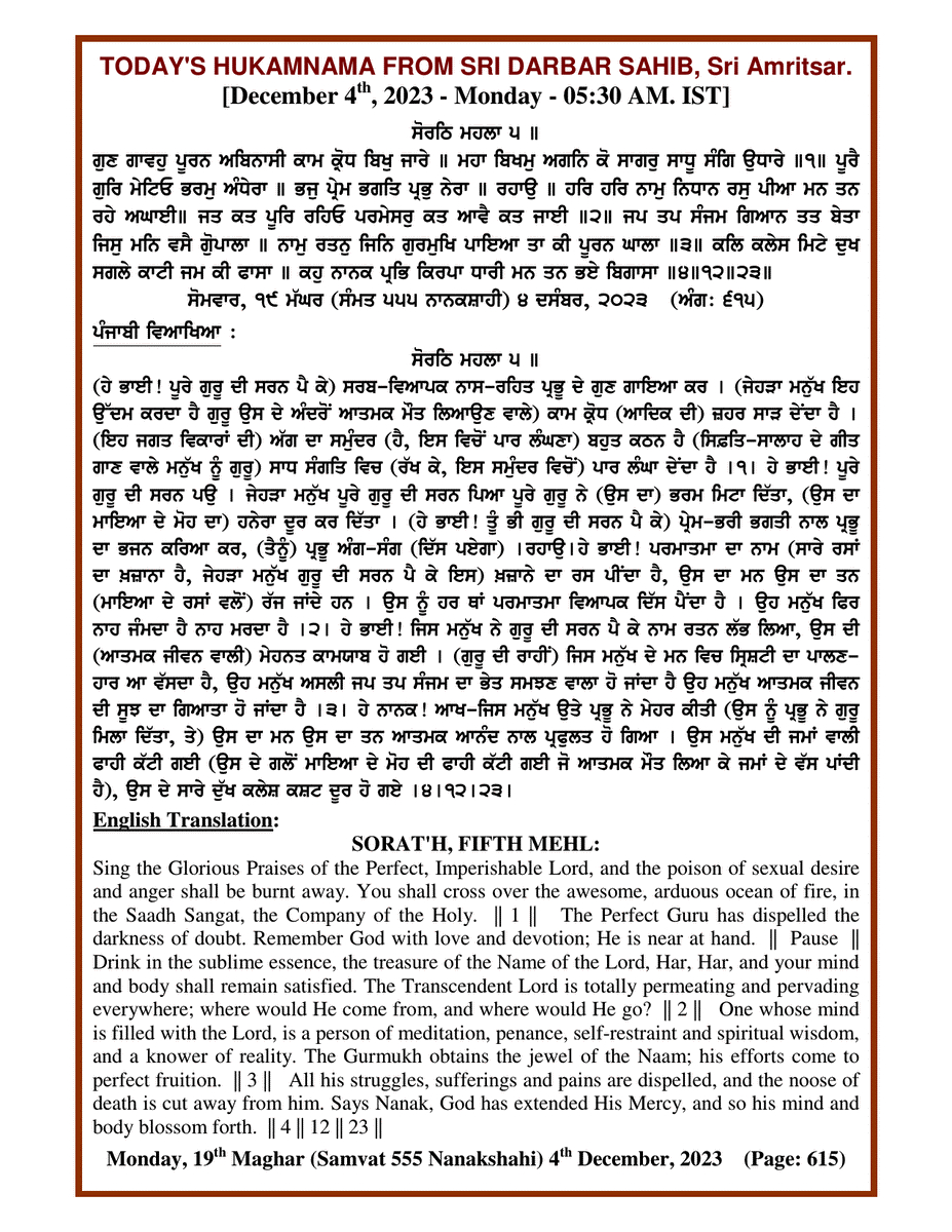 Source : SGPC Post navigation Today’s MUKHWAK Sri Darbar Saheb Amritsar – December 3rd, 2023 Today’s MUKHWAK Sri Darbar Saheb Amritsar – December 5th, 2023