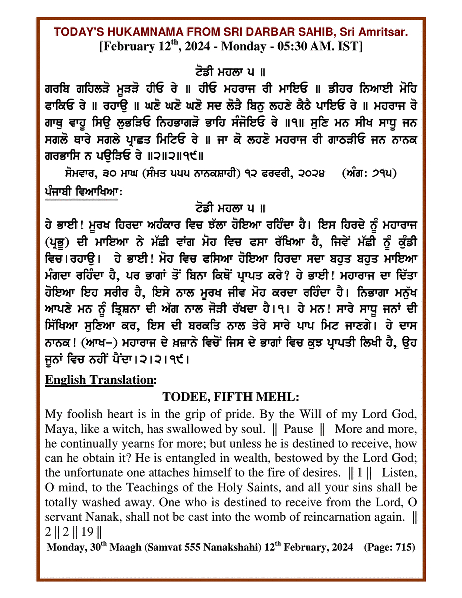 Source : SGPC Post navigation Today’s MUKHWAK Sri Darbar Saheb Amritsar – February 11th, 2024 Today’s MUKHWAK Sri Darbar Saheb Amritsar – February 13th, 2024