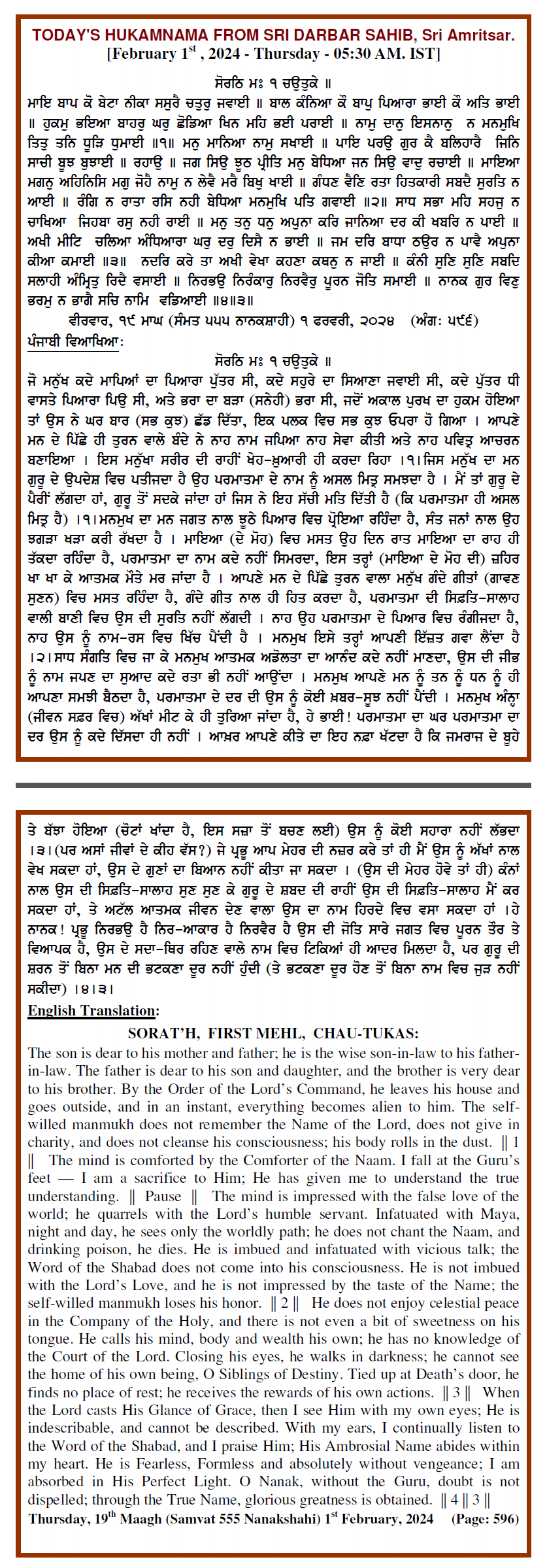 Source : SGPC Post navigation Today’s MUKHWAK Sri Darbar Saheb Amritsar – January 31st, 2024 Today’s MUKHWAK Sri Darbar Saheb Amritsar – February 3rd, 2024