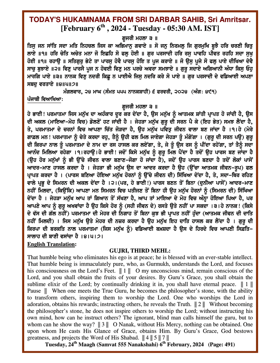 Source : SGPC Post navigation Today’s MUKHWAK Sri Darbar Saheb Amritsar – February 5th, 2024 Today’s MUKHWAK Sri Darbar Saheb Amritsar – February 7th, 2024