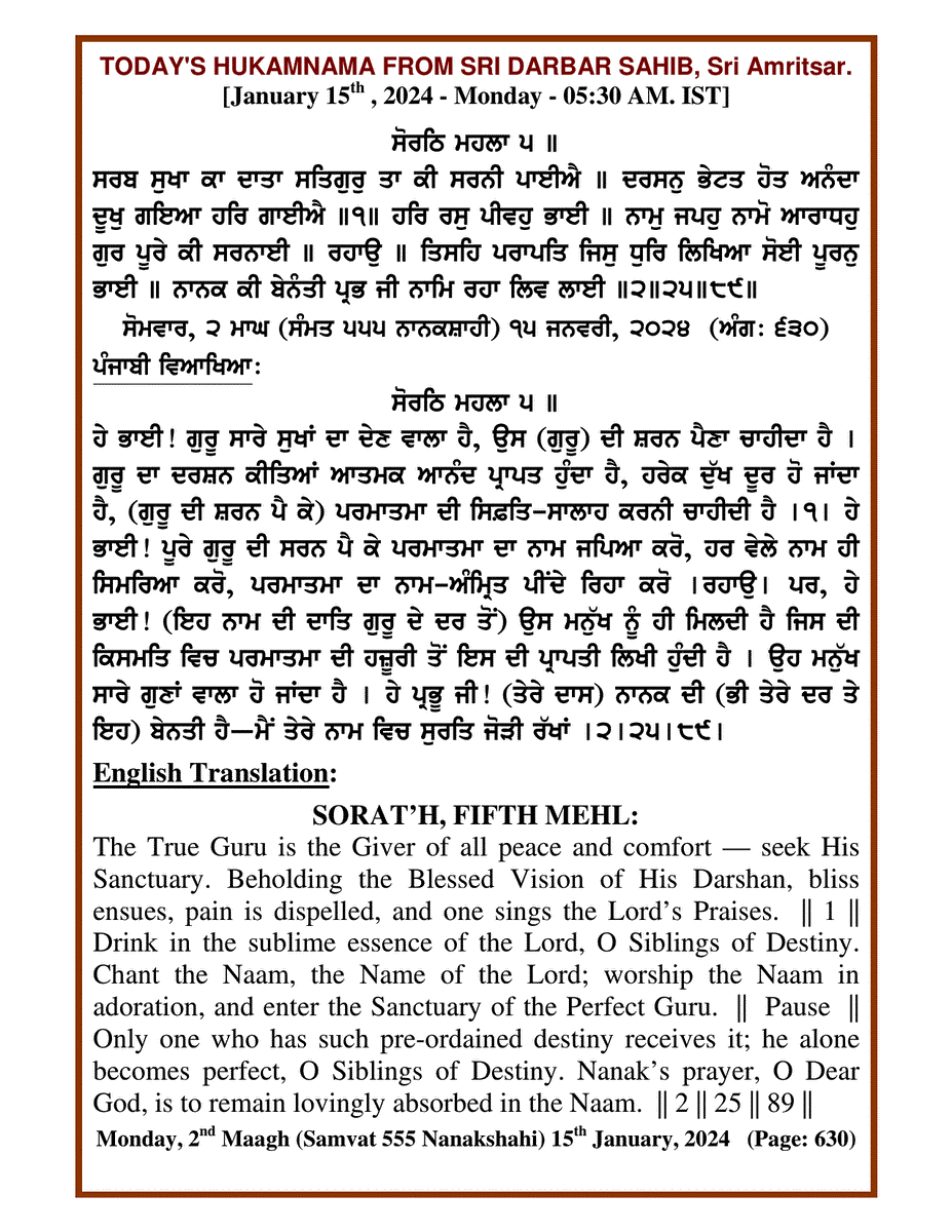 Source : SGPC Post navigation Today’s MUKHWAK Sri Darbar Saheb Amritsar – January 14th, 2024 Today’s MUKHWAK Sri Darbar Saheb Amritsar – January 16th, 2024