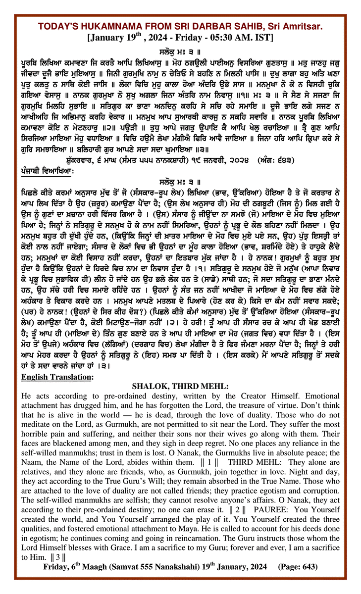 Source : SGPC Post navigation Today’s MUKHWAK Sri Darbar Saheb Amritsar – January 18th, 2024 Today’s MUKHWAK Sri Darbar Saheb Amritsar – January 20th, 2024