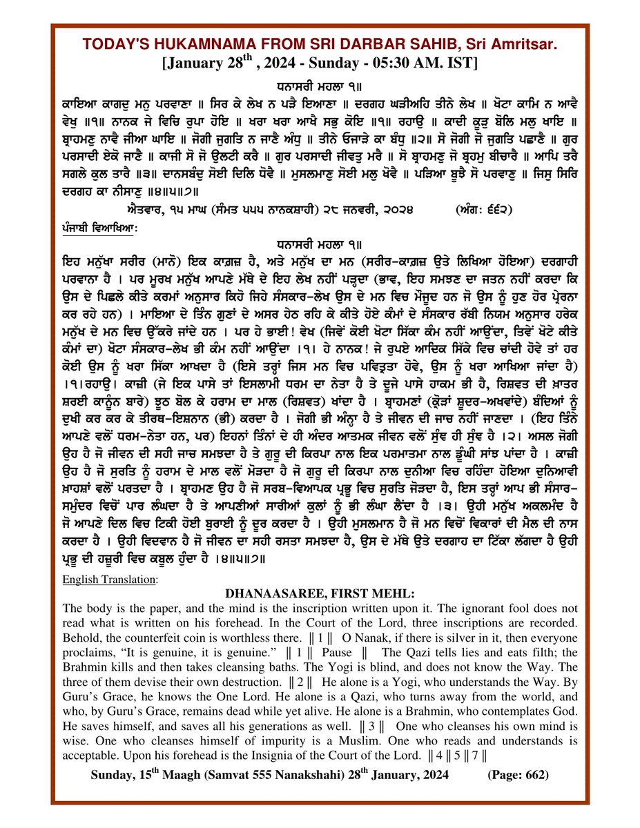 Source : SGPC Post navigation Today’s MUKHWAK Sri Darbar Saheb Amritsar – January 27th, 2024 Today’s MUKHWAK Sri Darbar Saheb Amritsar – January 29th, 2024