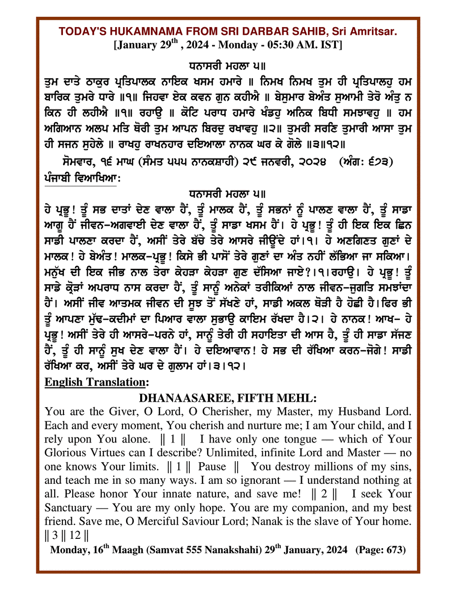 Source : SGPC Post navigation Today’s MUKHWAK Sri Darbar Saheb Amritsar – January 28th, 2024 Today’s MUKHWAK Sri Darbar Saheb Amritsar – January 30th, 2024