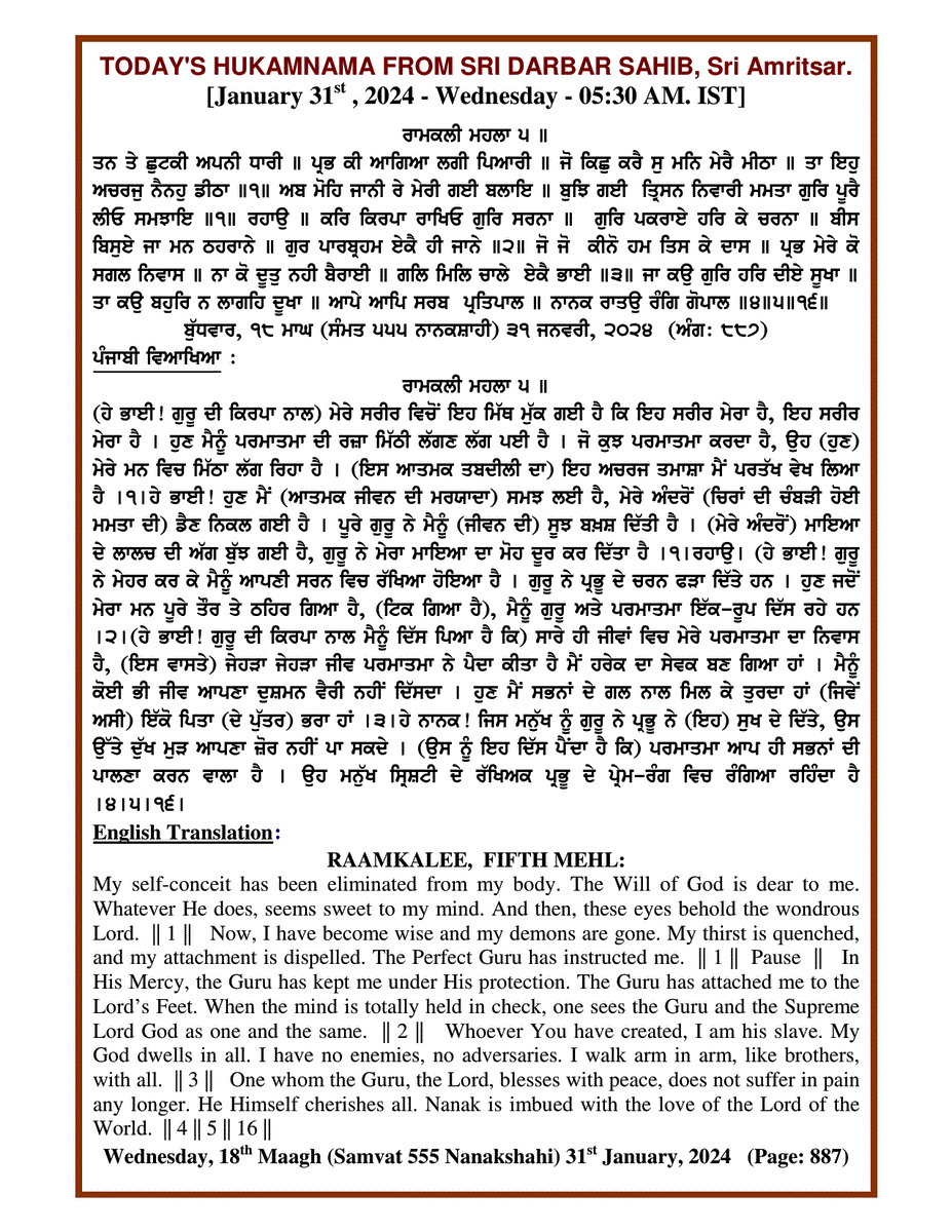 Source : SGPC Post navigation Today’s MUKHWAK Sri Darbar Saheb Amritsar – January 30th, 2024 Today’s MUKHWAK Sri Darbar Saheb Amritsar – February 1st, 2024