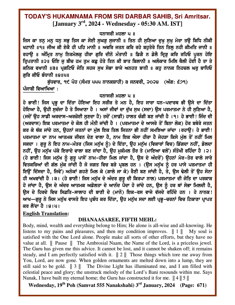 Source : SGPC Post navigation Today’s MUKHWAK Sri Darbar Saheb Amritsar – January 2nd, 2024 Today’s MUKHWAK Sri Darbar Saheb Amritsar – January 4th, 2024
